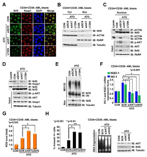 The effects of ATO on ROS induction and Akt phosphorylation seen in LSC-enriched AML cells prompted us to hypothesize that early activation of Akt by ATO may attenuate ROS induction by ATO, given the known effects of Akt phosphorylation on Nrf2 activation []. Using immunofluorescence and a cellular fractionation assay, we demonstrated that treatment of LSC-enriched progenitor cells with ATO induced Nrf2 translocation to the nucleus whereas knockdown (KD) or pharmacological inhibition of Akt with LY294002 reversed this effect (Figure 2A,B). These results demonstrate that early activation of Akt by ATO induces nuclear translocation of Nrf2, followed by Nrf2-induced transcription of antioxidant enzymes, which are known to attenuate ROS levels [,]. We next explored the mechanism of ATO-induced Nrf2 translocation. Previous studies showed that PI3K/Akt activation causes actin cytoskeleton rearrangement in response to oxidative stress, leading to Nrf2/actin complex translocation into the nucleus []. Of note, we observed that treatment with ATO induced actin translocation to the nucleus (Figure 2B), suggesting that ATO regulates nuclear translocation of the Nrf2/actin complex through Akt activation. Indeed, immunoprecipitation of nuclear extracts from LSC-enriched progenitor cells demonstrated that ATO enhanced the interaction of Nrf2 and actin in the nucleus, while co-treatment with AKT-siRNA or Akt inhibitor LY294002 disrupted this interaction (Figure 2C). As expected, ATO dissociated the Nrf2/Keap1 interaction (Figure 2D), resulting in Nrf2 nuclear translocation and decreased Nrf2 ubiquitination (Figure 2E). Knockdown (KD) of Akt with siRNA or pharmacological inhibition of Akt with LY294002 abolished these effects (Figure 2D,E). ATO-induced nuclear translocation and stabilization of Nrf2 resulted in increased transcription of the antioxidant enzymes NQO-1 and HO-1 (Figure 2F). Knockdown of Akt or Nrf2 by siRNA disrupted ATO-induced NQO-1 and HO-1 expression (Figure 2F), leading to increased levels of ROS (Figure 2G) and apoptosis, as demonstrated by increased Annexin V staining and induction of DNA fragmentation (Figure 2H). These results demonstrate that ATO-mediated apoptosis of LSC-enriched progenitor cells was attenuated by Nrf2 activation through ATO-induced ROS as well as early activation of Akt. Pharmacologic Akt inhibition could potentiate ATO cytotoxicity by inhibiting Nrf2 activation. Of note, synergistic killing of AML cells with ATO and Akt inhibitor LY294002 has previously been demonstrated. AML cells exhibited significantly reduced sensitivity to ATO when attached to human stromal cells; however, sensitivity to ATO was restored, at least in part, through inhibition of Akt [].