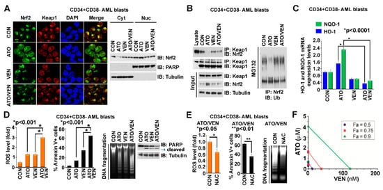 We previously showed that VEN is a potent inhibitor of Nrf2 activation induced by HMA []. We hypothesized that VEN could also inhibit ATO-induced Nrf2 activation and potentiate ATO-mediated cytotoxicity and thus examined the effects of the ATO+VEN combination on LSC-enriched AML progenitor cells. Our results demonstrate that addition of VEN to ATO blocked ATO-induced Nrf2 translocation to the nucleus in LSC-enriched AML progenitor cells, as shown by immunofluorescence labeling and cytoplasm-nuclear fractionation assays (Figure 3A). Addition of VEN also reversed the ATO-induced Nrf2-Keap1 dissociation, leading to Keap1-induced Nrf2 ubiquitination and degradation (Figure 3B). The addition of VEN also abolished ATO-Nrf2-induced upregulation of NQO-1 and HO-1 antioxidant enzyme transcription (Figure 3C). Consistent with our hypothesis, the ATO+VEN combination strongly augmented levels of mitochondrial ROS and apoptosis in LSC-enriched progenitor cells, as shown by MitoSOX staining for ROS, Annexin V flow cytometry, DNA fragmentation and cleaved PARP Western blot (Figure 3D). Pre-treatment of the progenitor cells with N-acetyl-l-cysteine (NAC), a ROS scavenger, followed by combined treatment with ATO and VEN, reduced ROS levels and inhibited apoptosis, as shown by diminished MitoSOX staining for ROS and attenuated Annexin V flow cytometry staining and DNA fragmentation, both markers of apoptosis (Figure 3E). These results demonstrate that VEN enhances the antileukemic effect of ATO on LSC-enriched progenitor cells at least partly through Nrf2 inhibition. We also performed drug combination studies based on the Chou-Talalay method [] to quantify the antileukemic effect of ATO and VEN on the LSC-enriched AML progenitor cells. The cells were treated for 72 h with the individual drugs or the ATO/VEN combination, followed by measurement of cell viability. Drug-synergy analysis revealed synergy between ATO and VEN, as shown by the cell viability curves (Supplemental Figure S1) and isobologram analysis (Figure 3F).