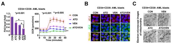 Addition of VEN to ATO inhibits mitochondrial metabolism in LSC-enriched AML progenitor cells. (A) Effects of the ATO and VEN combination on levels of FAO and OXPHOS. LSC-enriched progenitor cells were treated with 500 nM ATO, 10 nM VEN, or both. Left, levels of FAO were measured by the oxidation rate of 3H-palmitic acid. Right, levels of oxidative consumption rate (OCR) were measured by Seahorse cell energy testing assay. (B,C) Effects of the ATO and VEN combination on mitochondrial membrane potential and mitochondria morphology in LSC-enriched progenitor cells. The cells were treated as described in (A). (B) Mitochondrial membrane potential was measured by staining of the treated cells with JC-1 dye. The red and green fluorescence indicates JC-1 polymers and monomers, respectively. Scale bar, 10 µm. (C) Mitochondria morphology was measured by electron microscope imaging. Scale bar, 1000 nm.