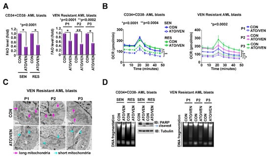Addition of VEN to ATO inhibits mitochondrial metabolism in VEN-resistant and -sensitive LSC-enriched AML progenitor cells. (A–D) Effects of ATO plus VEN on OXPHOS metabolism and apoptosis in VEN-sensitive and -resistant LSCs. CD34+CD38-cells isolated from VEN-sensitive (n = 3) and VEN-resistant (n = 3) primary AML patient samples were treated for 24 h with 10 nM VEN plus 500 nM ATO. (A) Levels of FAO. The levels of FAO of pooled samples (each, n = 3) are shown on the left and FAO levels of individual samples of VEN-resistant AML cells are shown on the right. (B) Levels of OCR. The levels of OCR of pooled samples (each, n = 3) are shown on the left and OCR levels of individual samples of VEN-resistant AML cells are shown on the right. (C) Mitochondria morphology of DMSO-treated or ATO+VEN-treated VEN-resistant primary AML cells was measured by electron microscope imaging. Red arrow, long (healthy) mitochondria. Green arrow, short (unhealthy) mitochondria. Scale bar, 1000 nm. (D) Levels of apoptosis. The levels of apoptosis demonstrated by DNA fragmentation and PARP cleavage of pooled samples are shown on the left and apoptosis levels of individual samples of VEN-resistant AML cells are shown on the right. FAO, fatty acid oxidation; OXPHOS, oxidative phosphorylation; VEN, venetoclax; ATO, arsenic trioxide.