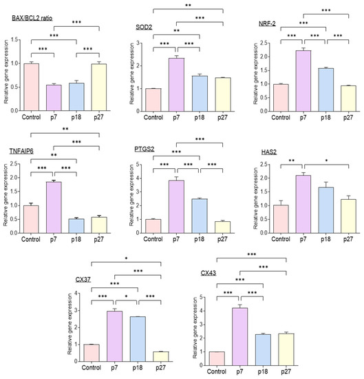 Figure 2 shows the relative expression of genes associated with apoptosis, antioxidant enzymes, cumulus cell expansion, and gap junctions in porcine cumulus cells analyzed using qPCR. The BAX/BCL-2 ratio was significantly lower in the eAFMSC-CMp7 group than in the control (p < 0.05). The expression of antioxidant-related genes, SOD2 and NRF-2, was significantly increased in the eAFMSC-CMp7 group compared to the control and other eAFMSC-CM groups (p < 0.05). Furthermore, the expression of genes associated with cumulus expansion, namely tumor necrosis alpha induced protein 6 (TNFAIP6) and prostaglandin-endoperoxide synthase 2 (PTGS2), was significantly increased in the eAFMSC-CMp7, compared to all other groups (p < 0.05). Levels of Cx43 transcripts were also significantly increased in eAFMSC-CMp7 compared to the other groups (p < 0.05).