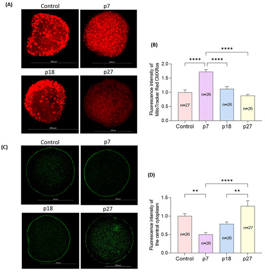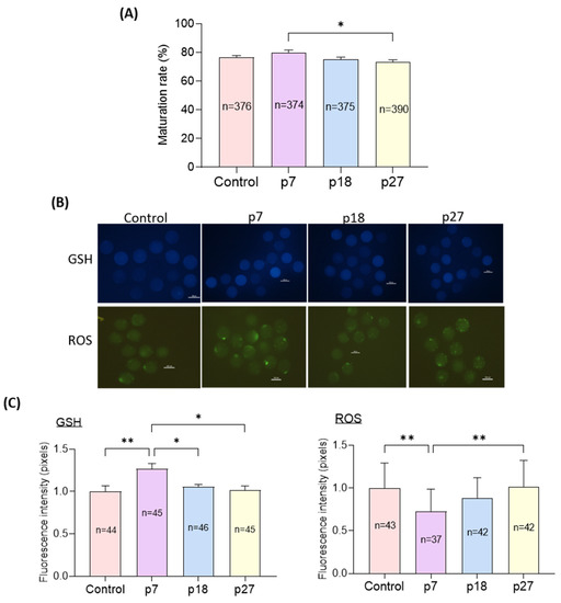 We evaluated the effects of eAFMSC-CM from passages 7, 18, and 27 (p7, p18, and p27, respectively) on oocyte cytoplasmic maturation after IVM for 44 h. Although nuclear maturation did not significantly differ among the four groups, the rate of maturation was significantly higher in the p7 than in the eAFMSC-CMp27 groups (81.7% ± 1.3% vs. 78.9% ± 1.7%, 76.3% ± 1.4%, and 72.0% ± 1.9%, respectively; p < 0.05; Figure 3A). The staining intensity of GSH was significantly increased (p < 0.05) in the eAFMSC-CMp7 group compared to the other groups, and was essentially the same among the control, p18, and p27 groups. The staining intensity of ROS was significantly decreased in the eAFMSC-CMp7 group compared to all other groups (p < 0.05; Figure 3B,C).