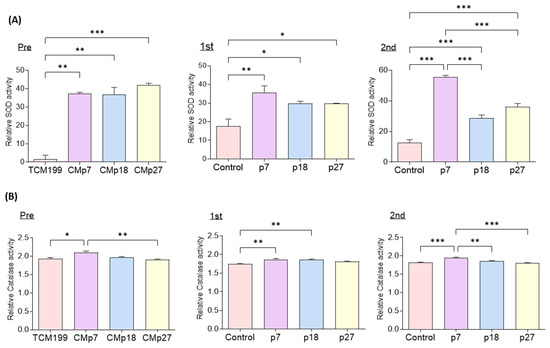 Evaluation of the SOD and catalase activity from IVM medium supernatant in comparison to the control and supplementation with different passage of eAFMSC-CM. (A) Superoxide dismutase (SOD) and (B) catalase activity. Pre; TCM199 (IVM medium) and Fresh CM. First; Medium after 22 h of IVM. 2nd; Medium after 44 h of IVM. The asterisks represent significantly different when compared to the control (*: p < 0.05, **: p < 0.01, ***: p < 0.001).