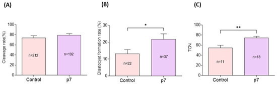 Cleavage rates did not significantly differ between the eAFMSC-CMp7 group and control group (79.2% ± 2.1% vs. 79.2% ± 3.1% p > 0.05; Figure 6A). However, blastocyst formation and the total number of blastocysts were significantly higher in the eAFMSC-CMp7, than in the control group (21.7% ± 3.2% vs. 14.5% ± 2.1%, and 74.4 ± 3.2 vs. 54.7 ± 5.1; p < 0.05 for both; Figure 6B,C, respectively).
