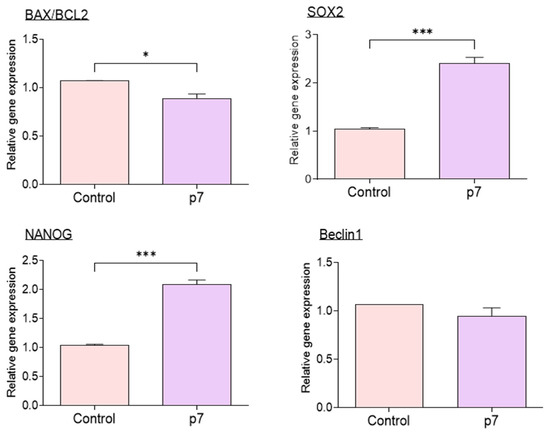 The expression of mRNAs associated with apoptosis, pluripotency, and autophagy in IVF blastocysts determined by qRT-PCR revealed a significantly decreased BAX/BCL2 ratio in the eAFMSC-CMp7 group compared to control group (p < 0.05; Figure 7), whereas Beclin1 expression did not differ between these groups. The expression of SOX2 and NANOG that are associated with pluripotency significantly differed between the control and eAFMSC-CMp7 groups (p < 0.05).