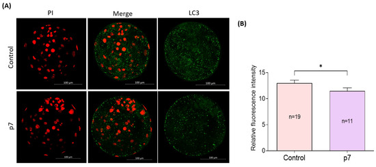Blastocysts were washed three times with PBS, fixed in 4% PFA-PBS (w/v) at RT, permeabilized with 0.5% Triton X-100 for 30 min at RT, and rinsed three times with 0.05% Tween-20 (5 min each). Non-specific antigen binding was blocked with 1% BSA in PBS for 1 h, and then the blastocysts were incubated overnight at 4 °C with 1:500-diluted rabbit anti-microtubule-associated protein 1A/1B-light chain 3 (LC3) (ab51520; Abcam, Cambridge, UK). They were then washed three times with 0.05% Tween-20 (5 min each) and labeled with 1:200-diluted Alexa Fluor 488 goat anti-rabbit IGF (ab150077; Abcam, Cambridge, UK) for 1 h at RT. After five washes with 0.05% Tween-20 for 5 min each, blastocysts were counterstained with 10 μg/mL PI for DNA labeling and visualized using the LSM 880 confocal laser-scanning microscope with filter (488 nm). Digital images of oocytes were analyzed with ImageJ software in order to measure the average fluorescence intensity (normalized to the background average intensity).