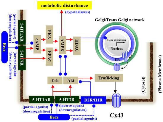 - Fukuyama, K.; Okada, M. Effects of atypical antipsychotics, clozapine, quetiapine and brexpiprazole on astroglial transmission associated with connexin43. Int. J. Mol. Sci. 2021, 22, 5623. [Google Scholar] [CrossRef] [PubMed]