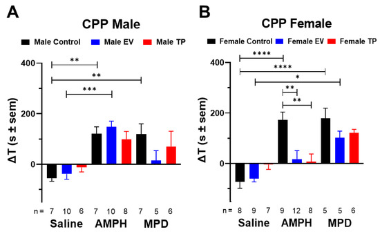 Rats used for CPP were assigned to the following experimental groups: female control (n = 22), male control (n = 21), female EV (n = 26), male EV (n = 25), female TP (n = 21) and male TP (n = 20). The CPP apparatus and the experimental protocol were previously used [17,36]. Briefly, the CPP protocol consisted of three parts: pre-test (one day before the conditioning period), the conditioning period and the test (24 h after the last injection). The conditioning period was associated with the psychostimulants-induced reward in the white compartment for 60 min, where we used AMPH (1 mg/kg i.p.) or MPD (5 mg/kg i.p.) in the morning and saline injection (1 mL/kg i.p.) in the afternoon (black compartment). The control group received the saline injection in the morning and the afternoon in the black and white compartment, respectively. Data are represented as time difference (ΔT) in seconds between the time spent in the white compartment on the test day and the pre-test day.