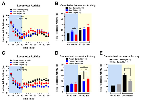 Cumulative basal locomotor activity (0–30 min) did not differ between control versus EV and TP male rats. However, we only observed a significant difference between EV versus TP male rats (Figure 2B) (F(2, 30) = 4.854; p = 0.0149). On the other hand, cumulative basal locomotor activity was not different between control, EV and TP female rats (Figure 2D) (F(2, 34) = 1.150; p = 0.3286).