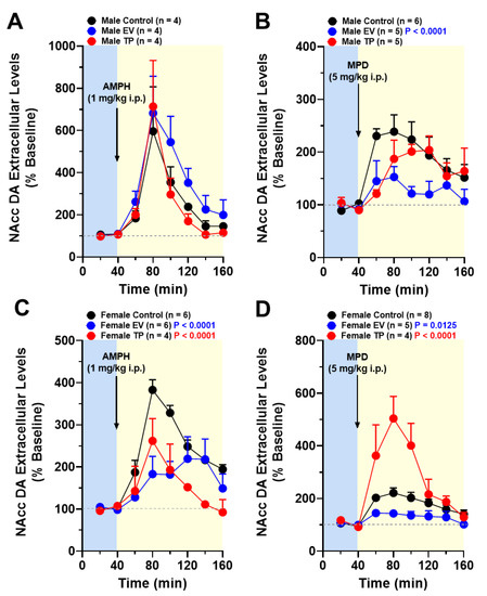 However, the long-lasting effects of neonatal exposure to sex hormones on midbrain dopaminergic neurons in response to psychostimulant drugs have not been thoroughly studied. Here, we examined the effects of EV or TP exposure during the first hours of postnatal life on locomotor activity and conditioned place preference induced by MPD (5 mg/kg i.p.) or AMPH (1 mg/kg i.p.) in female and male adult rats. Tonic and phasic DA release in the NAcc and striatum of rats treated with these psychostimulants was assessed by microdialysis and fast-scan cyclic voltammetry.