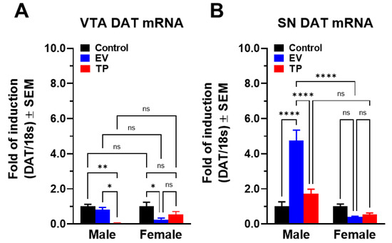 DAT mRNA expression was measured in the VTA and SN of adult male and female rats of experimental groups. VTA and SN are the main brain areas involved in synthesizing DA for release in NAcc and striatum, respectively. The DAT mRNA expression in VTA was lower in TP male rats than control and EV male rats. Meanwhile, in female rats, the DAT mRNA expression in VTA was lower in animals exposed to sex hormones than control female rats Figure 5A, (interaction: F(2, 36) = 5.044; p = 0.0117; sex: F(1, 36) = 0.04849; p = 0.8269; neonatal treatment: F(2, 36) = 9.407; p = 0.0005). Interestingly, DAT mRNA expression in SN was only increased in EV male rats with regard to the control group. However, in the SN of female rats, we did not observe significant differences in DAT mRNA expression Figure 5B, (interaction: F(2, 23) = 30.24; p < 0.0001; sex: F(1, 23) = 58.92; p < 0.0001; neonatal treatment: F(2, 23) = 18.11; p < 0.0001).