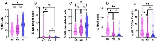 Innate immunological profile distribution in healthy controls (HC, n = 21), non-hospitalized (NH, n = 38), and severe COVID-19 patients (S. n = 24). (A) NK cells; (B) NK bright cells; (C) NK dim cells; (D) CD3+ MAIT cells; (E) CD8+ MAIT cells. HC, healthy controls; NH, Non-Hospitalized; S, Severe; ns, no significant; *, p < 0.05; **, p < 0.01.