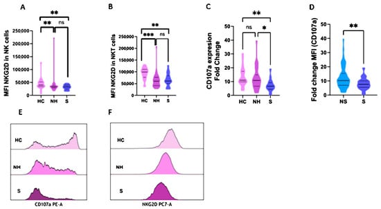 NK functionality in healthy controls (HC, n = 21), non-hospitalized (NH, n = 38), non-severe (NS, n = 75), and severe COVID-19 patients (S, n = 24). (A) MFI of NKG2D in NK cells; (B) MFI of NKG2D in NKT cells; (C,D) Fold Change (MFI CD107a); (E) CD107a MFI in NK cells, distribution for HC, NH, and S patients; (F) NKG2D MFI in NK cells, distribution for HC, NH, and S patients. HC, healthy controls; NH, Non-Hospitalized; NS, Non-severe; S, Severe; *, p < 0.05; **, p < 0.01; ***, p < 0.001.