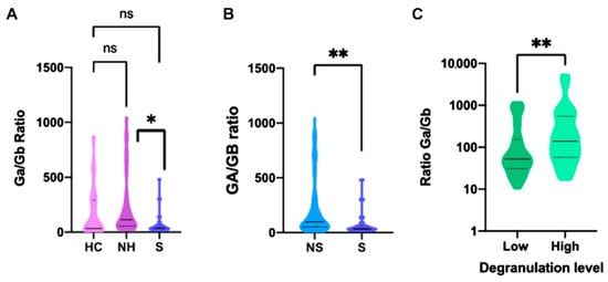 Granzyme ratio secretion according to disease severity. (A) Ga/Gb Ratio in HC, NH, and S COVID-19 patients; (B) Ga/Gb Ratio in NS and S COVID-19 patients; (C) Ga/Gb Ratio according to degranulation activity. HC, Healthy controls; NH, Non-hospitalized; NS, Non-severe; S, Severe. Low, CD107a expression Fold Change <9%; High, CD107a expression Fold Change >9%; *, p < 0.05; **, p < 0.01.