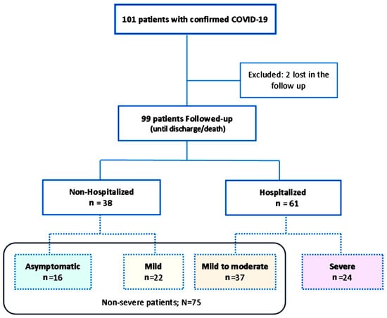 A prospective observational study was conducted by recruiting a cohort of 101 COVID-19 patients in a random manner in the Emergency Department of the Hospital Universitario 12 de Octubre (Madrid, Spain) from 17 May to 7 September 2021. Inclusion criteria were (1) adult patients (>18 years) with high suspicion of SARS-CoV-2 infection, (2) confirmed COVID-19 diagnosis by RT-PCR in the early acute phase of the disease, and (3) follow-up until discharge or death. Two patients were excluded as they were lost to the follow-up. Finally, 99 COVID-19 patients were enrolled in the study. During follow-up, 96 patients recovered and 3 died. Asymptomatic patients were identified in the emergency department as close contacts of other relatives with symptoms. They were followed up to assess the possible appearance of symptoms.