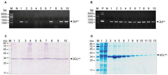Preparation of recombinant 3CLpro of SARS-CoV-2. (A) Amplicons of 3clpro amplified from 3clpro-pTriEx1.1-transformed DH5α E. coli clones. Lane M 1 kb DNA ladder; lane N, negative control (no DNA template); lanes 1, 2, 7, 9 and 10 show 3clpro amplicons at ~1300 base pairs (bp) (arrowhead) that were amplified from DH5α E. coli clones 1, 2, 7, 9 and 10, respectively. Transformed DH5α E. coli clones 3–6 and 8 were negative for the recombinant vector. (B) Amplicons of 3clpro amplified by using colonies of NiCo21 (DE3) E. coli as the direct DNA templates. Lane M, 1 kb DNA ladder; lane N, negative control (no DNA template); lane P, positive control; lanes 1–10, transformed NiCo21 (DE3) E. coli clones 1–10, respectively. Numbers at the left of (A,B) are DNA sizes in base pairs. (C) Recombinant 3CLpro produced by transformed NiCo21 (DE3) E. coli clones that contained recombinant 3clpro-pTriEx1.1 vector. Lane M, pre-stained protein ladder; lanes 1–10, rCLpro (~34 kD, arrowhead) of 10 NiCo21 (DE3) E. coli clones. (D) Purified recombinant 3CLpro after SDS-PAGE and CBB staining. Lane M, pre-stained protein ladder; lane 1, crude lysate of transformed NiCo21 (DE3) E. coli; lane 2, flow through fraction; lanes 3–12, 150 mM imidazole eluted fractions 1–10, respectively; lane 13, 1 M imidazole eluted fraction. Numbers at the left of (C,D) are protein masses in kDa.