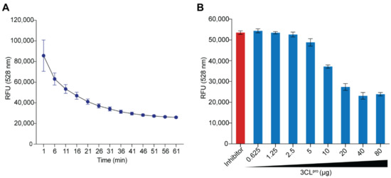 The purified E. coli-derived r3CLpro showed enzymatic activity when tested with the purified recombinant fluorogenic substrate in the FRET assay, as shown in Figure 2. In this experiment, 80 μg of the r3CLpro was mixed with 5 μg of the fluorogenic substrate and the reaction mixture was kept at 25 °C for 60 min. The emitted relative fluorescence units (RFU) at 528 nm were measured at 10 min-intervals. The r3CLpro cleaved the substrate in a time-dependent manner (Figure 2A). When various amounts of the r3CLpro (0.625–80 μg) were mixed with a fixed amount of the substrate (5 μg) and kept at 25 °C for 4 h, substrate cleavage was enzyme dose-dependent (Figure 2B).