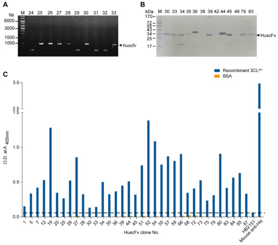 The phagemid transformed-HB2151 E. coli clones that grew on the agar were screened for huscfvs by direct colony PCR using R1 forward primer specific to the pCANTAB 5E phagemid (Tables S1–S3). The HB2151 E. coli clones positive for the huscfvs were grown in 2× YT-AG broth at 37 °C with shaking aeration (250 rpm) until the OD 600 nm were 0.3–0.5. The bacterial cells were collected after centrifugation of the cultures, resuspended in fresh 2× YT-A broth containing 1 mM IPTG, and incubated further for 3 h. The cultures were centrifuged to collect the bacterial pellets, which were then resuspended individually in 1 mL PBS. The bacterial cells were sonicated, and the homogenates were centrifuged (12,000× g, 4 °C, 20 min). The bacterial lysates were collected and the presence of E-tagged HuscFvs was determined by Western blot analysis using mouse anti-E tag antibody to probe the HuscFvs in the SDS-PAGE-separated lysates.