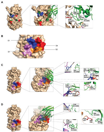 Nucleotides sequences of the huscfvs of the 35 HB2151 E. coli clones that expressed r3CLpro bound-HuscFvs were sequenced and deduced into amino acid sequences by using the IMGT/V-QUEST analytical tool. Amino acid sequences of 22 E. coli clones (clones 5, 12, 19, 25, 26, 27, 33, 34, 35, 36, 39, 44, 45, 51, 52, 55, 72, 73, 75, 80, 83 and 84) were complete single-chain antibody sequences, i.e., each of their VH and VL domains contained three CDRs (CDR1-3) and four FRs (FR1-4) with the (Gly4Ser)3 linker between the two domains, based on the International Immunogenetics Information Systems. Thus, the 3D structures of these 22 clones were docked with the 3CLpro 3D structure to guide selection of the HuscFvs with 3CLpro inhibitory potential. Among HuscFvs of the 22 E. coli clones, HuscFvs of three clones, 27, 33 and 34, bound presumptively to residues/regions of the 3CLpro that are critical for the enzymatic activity. In-silico docking predicted that the HuscFv27 interacted with Ser139 of the catalytic site (Figure 4A). This residue functions also in 3CLpro dimerization to form a functionally active enzyme. The HuscFv27 also interacted with another dimerization residue, Glu290 of the 3CLpro (Figure 4A). Figure 4B shows substrate-binding sites (S1′, S1, S2, and S4) of the 3CLpro. The S3 site cannot be seen as it is under the S1. HuscFv33 and HuscFv34 interacted presumptively with the substrate-binding pocket of the 3CLpro [33]. The HuscFv33 interacted with Met165 and Ala191 (Figure 4C), while the HuscFv34 interacted with Cys145 of the enzyme catalytic dyad, as well as Glu166, Thr190 and Ala191 (Figure 4D). Moreover, the HuscFv33 and HuscFv34 also interacted with the 3CLpro dimerization residues, i.e., Glu166 and Phe140 for HuscFv33 (Figure 4C) and Glu166 for HuscFv34 (Figure 4D). Table 1 gives details of the predicted residues, residue functions and domains of 3CLpro, and chemical bonds involved in the 3CLpro-HuscFvs interactions.