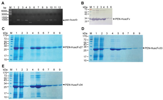 The huscfv sequences of the selected E. coli clones were subcloned from phagemid vector to pET23b+ vector that already carried inserted gene sequence coding for penetratin (PEN), a cell-penetrating peptide (CPP; RQIKIWFQNRRMKWKK), i.e., pen-pET23b+ vector [65]. The huscfv-pCANTAB 5E phagemids and the pen-pET23b+ vectors were digested doubly and similarly with SfiI and NotI restriction endonucleases. The huscfvs were ligated to the cut pen-pET23b+ vectors and the recombinant plasmids were transformed into DH5α E. coli by heat-shock transformation as described previously. The transformed preparations were spread on LB-A agar plates and incubated at 37 °C overnight. The E. coli colonies grew on the plate and carried PEN-HuscFv-pET23b+ plasmids [screened by direct colony PCR using T7 promotor and terminator oligonucleotide primers (Tables S1–S3)] were grown in LB-A broth and the recombinant plasmids were extracted for verification by Sanger sequencing. The verified plasmids were transformed into BL21 (DE3) E. coli expression host by heat shock transformation as described above. The BL21 (DE3) E. coli clones with recombinant PEN-HuscFv-pET23b+ plasmids were detected by direct colony PCR using the T7 promotor and terminator oligonucleotide primers. Positive clones were grown in Lennox broth containing ampicillin (100 µg/mL) and incubated at 37 °C overnight. One hundred microliters of the overnight cultures were inoculated into 10 mL of fresh Lennox broth containing the ampicillin and grown at 37 °C with shaking (250 rpm) until OD 600 nm reached 0.3–0.5. Isopropyl β-d-1-thiogalactopyranoside was added to individual cultures (0.25 mM final concentration) and the preparations were incubated further for 3 h. The IPTG induced-bacterial cells were harvested by centrifugation (4000× g, 4 °C for 30 min); the bacterial pellet was resuspended in 500 µL of 50 mM sodium phosphate buffer, pH 7.0 containing 300 mM NaCl and 8 M urea (binding buffer), and boiled for 5 min. The preparations were centrifuged (12,000× g, 4 °C, 15 min); the supernatants were collected and mixed with 6× sample buffer containing SDS and 2-mercaptoethanol, boiled for 5 min, and subjected to SDS-PAGE (12% gel). The separated components were blotted onto NC, which was then blocked with 5% skimmed milk in Tris buffered saline, pH 7.6 containing 0.01% Tween-20 (TBS-T) for 1 h. The NC was washed with TBS-T three times before placing in a solution of mouse anti-6× His monoclonal antibody (Bio-RAD) and kept at 25 °C for 1 h, washed with TBS-T and submerged in a solution of goat-anti-mouse Ig-alkaline phosphatase conjugate (SouthernBiotech) for 1 h. The reactive bands were revealed by using BCIP/NBT substrate (KPL). The enzymatic reaction was stopped by rinsing the NC with distilled water.
