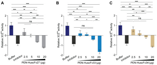Inhibition of 3CLpro activity by the PEN-HuscFvs as determined by FRET assay. In the assay, 20 μg of recombinant 3CLpro was mixed with buffer (negative inhibition control), inhibitor (positive inhibition control), or various amounts of PEN-HuscFvs (2.5, 5, 10 and 20 μg). Individual mixtures were added to appropriate wells of a 96-well flat and clear bottom black plate and the plate was kept on an orbital shaker at 25 °C for 30 min. The r3CLpro fluorescent substrate (5 μg) was added to each well and the plate was kept shaking for 4 h. Fluorescent signals were recorded at the excitation wavelength 436 nm and emission wavelength 528 nm using Synergy H1 Microplate reader. (A–C) are relative 3CLpro activities in the presence of PEN-HuscFv27, PEN-HuscFv33, and PEN-HuscFv34, respectively. ns, not significantly different; * p ≤ 0.05; ** p ≤ 0.01; *** p ≤ 0.001; **** p ≤ 0.0001.