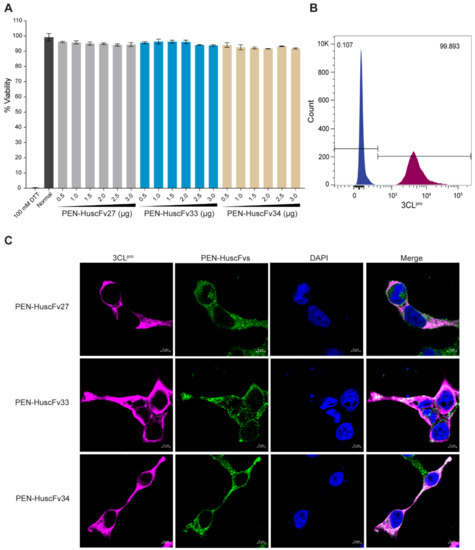 Biocompatibility of the PEN-HuscFvs to mammalian cells, mammalian cells expressing 3CLpro, and ability of the PEN-HuscFvs to enter mammalian cells. (A) Percent viability of human lung epithelial (A549) cells after exposure to 0.5–3.0 µM of PEN-HuscFv27, PEN-HuscFv33, and PEN-HuscFv34, compared to cells incubated with 100 mM DTT (cytotoxic control) and cells in culture medium alone (non-cytotoxic control; Normal). (B) Flow cytometric analysis of cells that expressed 3CLpro (3CLpro-HEK293T cells; dark magenta) compared to cells without 3CLpro (blue). (C) The 3CLpro-HEK293T cells containing intracellular 3CLpro were incubated with PEN-HuscFv27, PEN-HuscFv33, and PEN-HuscFv34. The PEN-HuscFvs (green) were found to co-localize with the intracellular 3CLpro (magenta) which then appear light pink or white upon merging. Nuclei stained blue by DAPI.