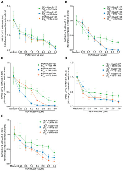 The anti-SARS-CoV-2 activity of the PEN-HuscFvs (superantibodies) in reduction of intracellular viral mRNAs. SARS-CoV-2 mRNA in infected cells treated with different concentrations of the PEN-HuscFv27, PEN-HuscFv33, and PEN-HuscFv34 compared to infected cells exposed to medium alone. The half-maximal effective concentrations (EC50) of individual superantibodies against indicated SARS-CoV-2 wild type and variants are shown in individual Figure insets. (A) Wuhan wild type; (B) α (B.1.1.7); (C) β (B.1.351); (D) δ (B.1.617.2) and (E) Omicron (B.1.1.529) variants.