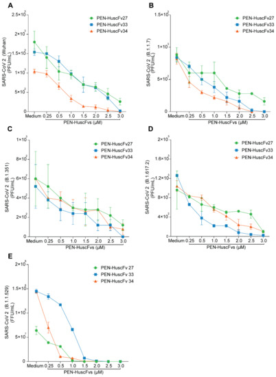 The anti-SARS-CoV-2 activity of the PEN-HuscFvs (superantibodies) in reducing the numbers of infectious virions (PFU/mL or FFU/mL) released from infected cells. The numbers of the infectious virions were determined by plaque forming assay (PFA) for Wuhan wild type and α, β and δ variants, and by focal formation assay (FFA) for Omicron variant. (A) Wuhan wild type; (B) α (B.1.1.7); (C) β (B.1.351); (D) δ (B.1.617.2) and (E) Omicron, B.1.1.529 variants.