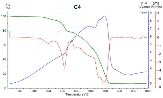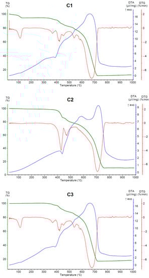 | 2nd stage of ligand decomposition | 540–725 °C 64.1% | 520–760 °C 75.9% | 450–710 °C 57.2% | 450–740 °C 72.2% | 12, 13, 17, 18, 22, 26, 27, 29, 30, 35, 36, 37, 38, 41, 44, 45, 46, 70, 72, 79 *, 81 *, 158 *, 160 *, 162 * |