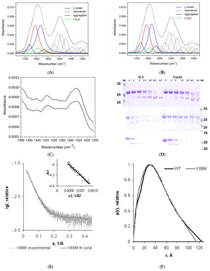 The linearity of the Guinier plots at very small angles, i.e., s < 1.3/Rg, (see the insert in Figure 1E) confirmed the homogeneity of the sample, despite the occurrence of a rather small degree of aggregation. The derived experimental scattering patterns of V66M did not show any concentration-dependent self-association. The processed scattering data is shown in Figure 1E, and the corresponding computed distance distribution function p(r) is compared to the one derived for the WT protein [44] (Figure 1F).