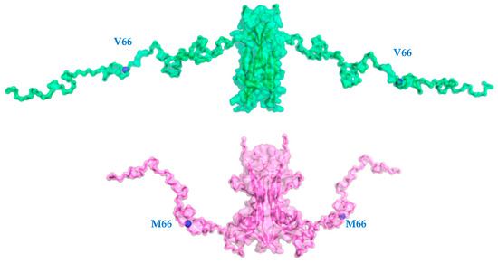 In silico prediction unveiled the likely occurrence of naturally disordered regions in either proBDNF, and its V66M variant [38,39]. Extended molecular dynamics simulations on a 3D ab initio generate model and homology modelling prompted the V66M polymorphism [40] to affect the essential motions, the hydrogen-bonding network, and the local and non-local secondary structure conformation of the proBDNF pro-domain. Lastly, a structural bioinformatics and molecular dynamics simulation study [41] pointed out the V66M mutation to induce instability in hproBDNF-HAP1 and hproBDNF-Sortilin1 complexes.