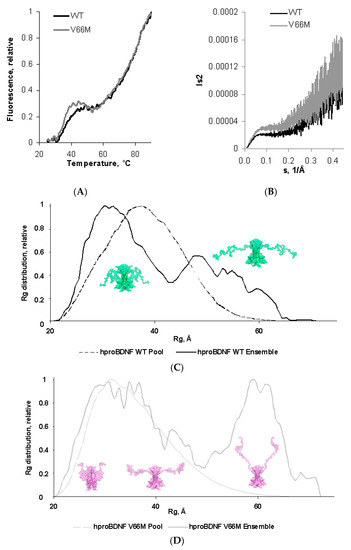 In detail, Kratky plot is an extremely useful representation of the scattering intensity for qualitative assessment of the protein disorder without any modelling; I(s) decays as s−4 for compact proteins, whereas the scattering intensity of a flexible Gaussian chain decays as s−2 or slower [49]. Thus, while compact proteins have s2I(s) values that approach zero (or baseline) at high s, unfolded or disordered proteins, such as the two variants of hproBDNF, will generally have a plateau at intermediate angles followed by continuously increasing values of s2I(s) at wide angles [50,51,52]. This behavior seems to be even more pronounced in the V66M variant (Figure 3B).