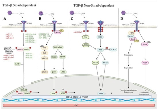 Signaling pathways related to the activation of TGFβ-induced Epithelial Mesenchymal Transition (EMT) in Idiopathic Pulmonary Fibrosis (IPF), and examples of some associated miRNAs. (A) Smad signaling TGFβ-induced activates transcription factors that promotes the EMT; (B) Non-Smad signaling TGFβ-induced includes the activation of Erk1/2, p38 and JNK MAPK kinases pathways; (C) Non-Smad signaling TGFβ-induced activates a receptor with tyrosine kinases activity, which activates both P13K/Akt/mTOR and NF-kβ pathways; (D) Non-Smad signaling TGFβ-induced activates ubiquitin-mediated RhoA degradation at tight/adherens junctions or Rho kinase activity during the assembly of actin stress fibers in the TGFβ-induced EMT. Red color indicates up-regulated miRNAs, and green color indicates downregulated miRNAs.