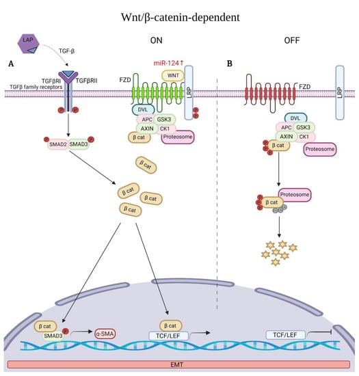 Wnt/β-catenin dependent signaling pathway and an example of associated miRNA (red) in Idiopathic Pulmonary Fibrosis (IPF). (A) The binding of Wnt to its receptors Frizzled (FZDs) and to phosphorylated lipoprotein receptor-related protein (LRP) leads to activation of the Wnt signaling pathway. β-catenin is stabilized and translocated in the nucleus, where it binds to T-cell factor/lymphoid enhancer factor-1 (TCF/LEF) to upregulate target genes. TGFβ1 synergizes with nuclear β-catenin regulating alfa-SMA expression. (B) In the absence of Wnt, β-catenin is degraded by the proteosome. Red color indicates upregulated miRNA, Stars represent byproducts of β-catenin degradation.