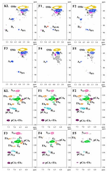 - Heikkinen, S.; Toikka, M.M.; Karhunen, P.T.; Kilpeläinen, I.A. Quantitative 2D HSQC (Q-HSQC) via suppression of J-dependence of polarization transfer in NMR spectroscopy: Application to wood lignin. J. Am. Chem. Soc. 2003, 125, 4362–4367. [Google Scholar] [CrossRef]