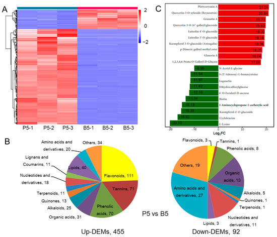 Differentially accumulated metabolites (DAMs) between endopleura and embryo in mature nut. (A) The heat map of DAMs in P5 vs. B5. (B) The classification of up- and down-DAMs, and the number of each classification. (C) Twenty metabolites with the greatest difference in content between endopleura and embryo.