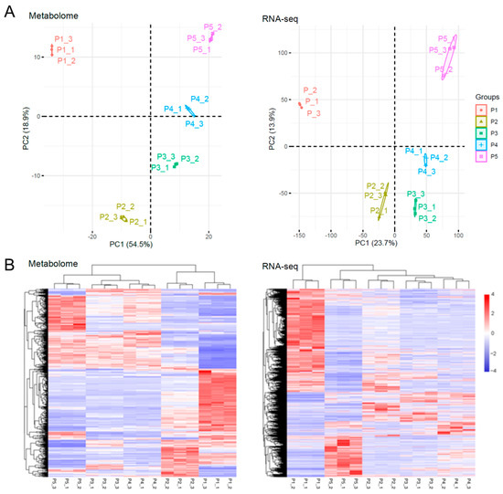 PCA of the gene expression profiles showed that the two principal components explained 37.6% of the total variance (Figure 3A). A total of 6300 DEGs were identified by pair comparison between samples at each stage (Figure S3). Cluster analysis is shown in Figure 3B, and the results showed that more DEGs were highly expressed in P1 sample than that in other samples. The 15 samples could be divided into three groups: P1 formed the first group; P2, P3, and P4 constituted the second group; and P5 formed the third group. Overall, the PCA of metabolome and RNA-seq was similar, but the clustering of DAMs and DEGs was not consistent. This may have been because the translation of RNA into protein then catalyzes the synthesis of metabolites, and RNA and metabolites have different accumulation patterns [23,24].
