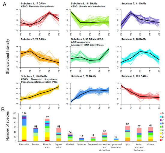 K-means diagram of differential metabolites and classification statistics. (A) Clustered DAM profiles in developing endopleura. The clusters were defined on the basis of metabolite content profile using the k-means method in R. (B) Quantity statistics based on metabolite species. The colors come from the classification of the subclass.