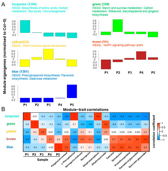 In order to understand the relationship between the gene expression patterns and metabolites, association analysis was performed using WGCNA (Figure 5B). Polyphenol content and polyphenol-related metabolites were highly correlated with blue and brown modules. In combination with KEGG pathway and module-trait correlation analysis, blue and brown modules were associated with polyphenol biosynthesis.