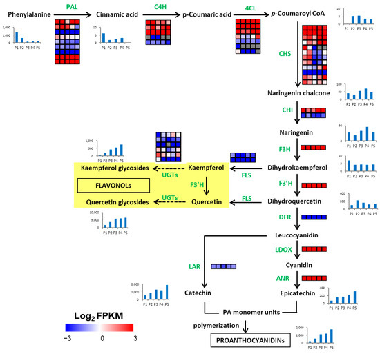 Transcriptional model of polyphenol biosynthesis in the developing walnut endopleura. The descriptions of genes is listed in Table 3. The rows represent different genes encoding the same enzyme, and the five squares in each horizontal row correspond to five stages (P1, P2, P3, P4, and P5). Grey squares mean FPKM = 0. The blue bar graph indicates the change in the content of metabolites in the metabolome (Table 2), and the Y-axis of the bar graph shows the relative content.