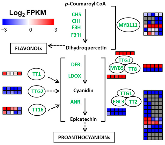 - Appelhagen, I.; Lu, G.H.; Huep, G.; Schmelzer, E.; Weisshaar, B.; Sagasser, M. TRANSPARENT TESTA1 interacts with R2R3-MYB factors and affects early and late steps of flavonoid biosynthesis in the endothelium of Arabidopsis thaliana seeds. Plant J. 2011, 67, 406–419. [Google Scholar] [CrossRef]