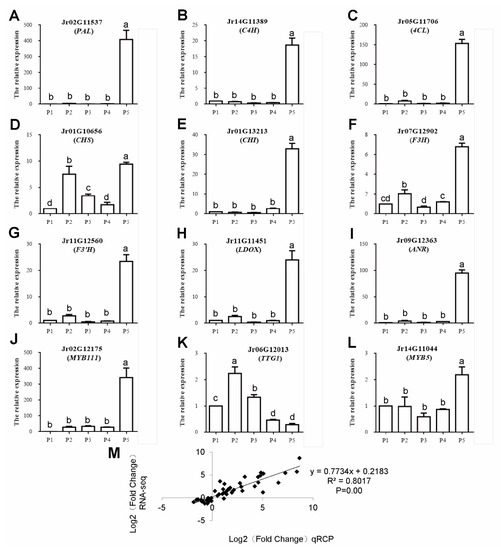 qPCR validation of differential expression. (A–L) qPCR of 12 important genes associated with polyphenol biosynthesis. Symbols represent mean values and short vertical lines indicate SE (n = 3). Same letters stand for statistically insignificance (p > 0.05). The unit of measure on the x-axis is sample. (M) A comparison of the gene expression ratios obtained from RNA-seq data and q-PCR.