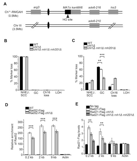 2.4. Chl1 Mutants Display Reduced DNA Repair Efficiency by HR and NHEJ Pathways