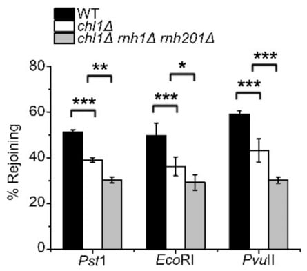 | ywp168 ywp1545 | h+ Leu1-32 ura4DS/E chl1Δ::HphMX6 h+ Leu1-32 ura4DS/E rnh1∆::NatMX4 rnh201∆::KanMX4 chl1∆::HphMX6 |