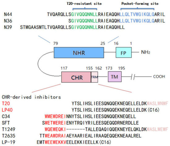 Schematic illustration of HIV gp41 and peptide fusion inhibitor. FP, fusion peptide; NHR, N-terminal heptad repeat; CHR, C-terminal heptad repeat; TRM, tryptophan-rich motif in the CHR; TM, transmembrane domain; CT, cytoplasmic tail. The sequences corresponding to the T20-resistant site and the pocket-forming site are marked in green and blue, respectively, on the NHR-derived peptide N36. The sequences corresponding to the pocket-binding site and TRM are marked in red and purple, respectively, on the CHR-derived peptide C34.