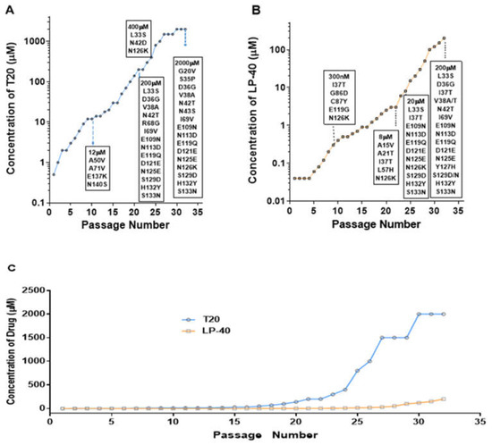 Introduction of T20- and LP40-resistant HIV-1. (A) The dose-escalating selections were conducted for a total of 32 passages, with T20 concentrations ranging from 500 nM to 2000 µM, and (B) for 32 passages, with LP40 concentrations ranging from 40 nM to 200 µM. At the indicated passage number, viral RNA was extracted from the supernatant, and gp41- and gp120-coding regions were sequenced. The mutations of gp41 are listed in the black frames. (C) HIV-1 NL4-3 was passaged in the presence of an increasing concentration of the inhibitors in C8166 cells.