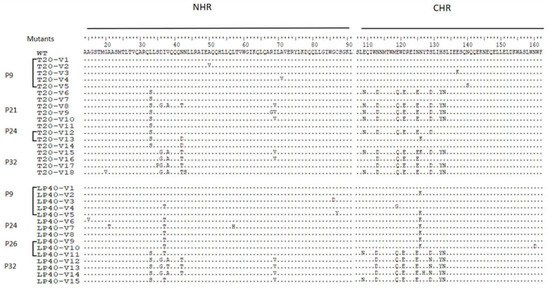 The in vitro selection of HIV-1 resistance to the peptide inhibitors T20 or LP-40 was performed as described previously. Briefly, the infectious viruses of HIV-1 NL4-3 were generated via the transfection of 293T cells with an encoding plasmid. C8166 cells were seeded at 1 × 104 in RPMI 1640 medium containing 10% fetal bovine serum (FBS) on 12-well plates. Virus infection of the cells was tested in the presence or absence of diluted T20 or LP-40. Cells were incubated at 37 °C with 5% CO2 until an extensive cytopathic effect was observed [27,28,29]. Culture supernatants were harvested and used for the next passage on fresh C8166 cells, with a 1.5- to 2-fold increase in peptide concentrations. Two replicate wells were made for each sample, and the cells and supernatants were collected periodically and stored at −80 °C.