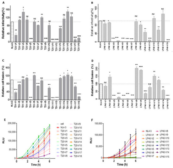 Additionally, we compared the differences between the wild-type envelope proteins and the serial mutant proteins in mediating membrane fusion using a double-separated protein-based fusion experimental system. In this assay, 293T cells act as effector cells that express both DSP1-7 and the envelope proteins. The 293T cells stably expressing DSP8-11/CD4/CXCR4/CCR5 were used as target cells. After the fusion of the effector cells and the target cells, the fluorescent reporter could be detected with the assistance of the live cell substrate, and the strength of the fluorescence could also indicate the ability and the rate of fusion. In the analysis of the fusion experimental results, we set the fusion capacity of each subtype WT at 100% to calculate the fusion capacity of both mutant strains. The results are shown in Figure 4C: an almost complete loss of fusion ability in T20-V5, T20-V9, T20-V11, and T20-V12 (p < 0.0001) in a series of 18 mutations with T20-induced drug resistance. T20-V1 and T20-V18 (p < 0.0001) had a 40% lower fusion ability than the wild-type; T20-V2, T20-V7, T20-V10, and T20-V17 had a 20–40% lower fusion ability than the wild-type; and T20-V6 (p < 0.001), T20-V4, T20-V13, T20-V14, T20- V15, and T20-V16 (p < 0.05) were all increased compared to the wild strain. Among the 15 series of mutations in which LP-40-induced resistance, LP40-V3, LP40-V5, LP40-V6, LP40-V7, and LP40-V15 (p < 0.0001) fusion ability was almost completely lost, and LP40-V4 and LP40-V10 membrane fusion ability was only less than 40% of that of the wild strain. In contrast, LP40-V2, LP40-V8, LP40-V9, LP40-V12, and LP40-V13 had improved fusion ability compared with the wild-type strain (Figure 4D). As shown in Figure 4E,F, we measured the dynamic fusion curves of different mutant strains within 0–6 h to visually and dynamically observe the fusion rates of mutant strains. Among them, we selected the fusion ability of the sixth hour to evaluate the mutant strains. The fusion activity is shown in Figure 4C,D.