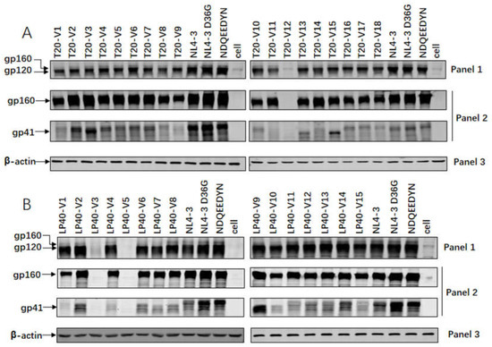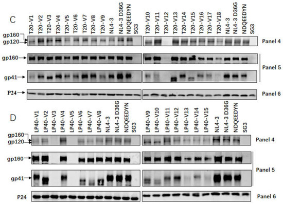 Figure 5B shows the gp160/gp120/gp41 protein levels in the cell lysate samples. No corresponding protein expression was detected via the abnormal protein expression of LP40-V3 and LP40-V5. The mutations in the cell lysates were almost comparable to the gp120/gp160 protein expression levels of the WT envelope protein. The LP40-V1, LP40-V4, LP40-V7, LP40-V8, LP40-V10, LP40-V11, and LP40-V15 mutations showed reduced gp41 protein expression levels compared to the WT envelope protein. We noticed an interesting phenomenon in that a high level of gp41 protein expression corresponded to an enhanced entry or fusion capacity of the viral strains, but reduced protein expression did not necessarily affect entry or fusion capacity.