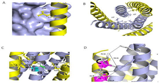 Structural basis of HIV-1 resistance to T20 and LP40. The effects of the resistance mutations on the binding stabilities of T20 or LP40 were analyzed using the crystal structure of T20/N39, shown as a ribbon model. Three N39 peptides are colored in blue, and three T20 peptides are colored in yellow. (A,B) The residues Leu33, Leu34, and Val38 are shown on the surface; Ile37 (colored in blue) and their interacting residues on N39, Leu149, and Asn147 (colored in yellow) are shown as stick models with labels. (C) Asn42 and Asn43 (colored blue), and their mutations, Thr42 and Ser43 (colored green and cyan), Glu137, Ser138, Glu142, and Gln144 on N39 (colored in yellow), and Glu146 on N44 (colored in gray), are shown as stick models with labels. (D) The effects of NDQEEDYN on the interactions of the viral NHR and CHR helices were analyzed using the crystal structure of N36/C34, shown as a ribbon model. N36 peptides are colored in blue, and the C34 peptides are colored in yellow. Asp121 (colored in yellow) and its mutation Glu121 (colored in magenta), and Asn125 (colored in yellow) and its mutation Glu125 (colored in magenta) are shown as stick models with labels. Their interacting residues on C34 and Lys63 (colored blue) are shown as stick models with labels. In order to confirm the interaction between Glu121, Glu125, and Lys63, we analyzed these interactions in SFT/N36; the conformations of Glu121 and Glu125 (colored in gray) in SFT are different from Glu121 and Glu125 (colored in magenta) in C34. The solid black lines indicate salt bridges, and the dashed lines indicate hydrogen bonds.